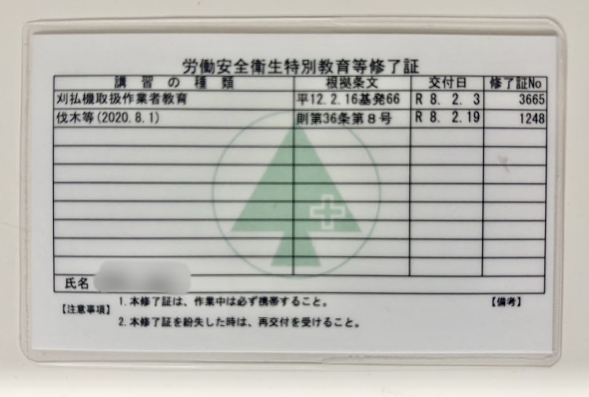 2026.02.19お知らせ「伐木等作業従事者特別教育」受講してきました! 今回も新しいスタッフさんに「伐木等作業従事者特別教育」を受講してきてもらいました!最近は、草刈りだけではなく 伐採のご依頼も増えてきているので 社員全員、必ず受講しています😊 伐木等(チェーンソー)を扱うのは本当に危険な作業なので💦3日間の受講を終え、すごく勉強になったと喜んでいました✨ 今後も伐採のお仕事の予定があるので、勉強したことを活かして、安全に作業します‼️もちろんお電話でのお問い合わせも大歓迎です! お電話でのお問い合わせはこちら ▶︎▶︎▶︎ 投稿ナビゲーション